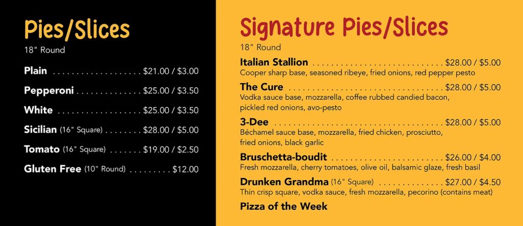 Take a step back from the on-the-go, feeling and let Anomalia fill you with excitement and the nostalgia of the good old days. The ones where you could just sit and have a slice with the people you love. We take the classic New York slice shop feel, mix it with some unique flavor profiles, personal touches, and some corny Pop-Culture movie references to provide you with a Pizza experience that will make you crave more.