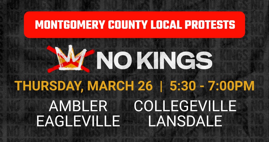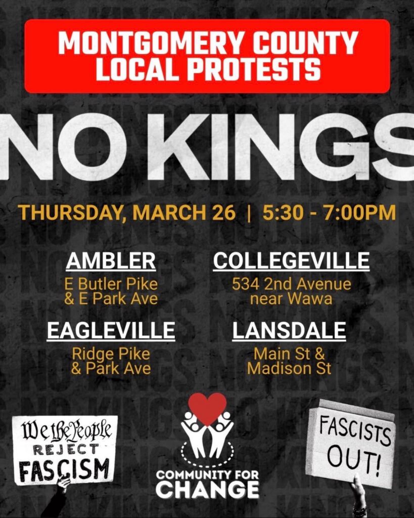 A “No Kings” protest is expected to be held at E Butler Pike and E Park Avenue in Ambler on Thursday, March 26 from 5:30 – 7:00pm.