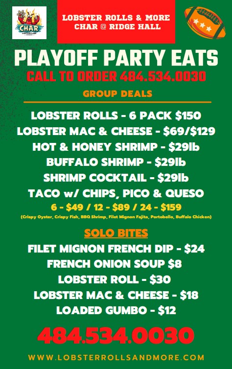 Enjoy the playoff game on Sunday, January 11th, with catering from Lobster Rolls & More, or head to the watch party at The Factory, upstairs at Ridge Hall, and enjoy something off the menu from Char. The watch party is free.