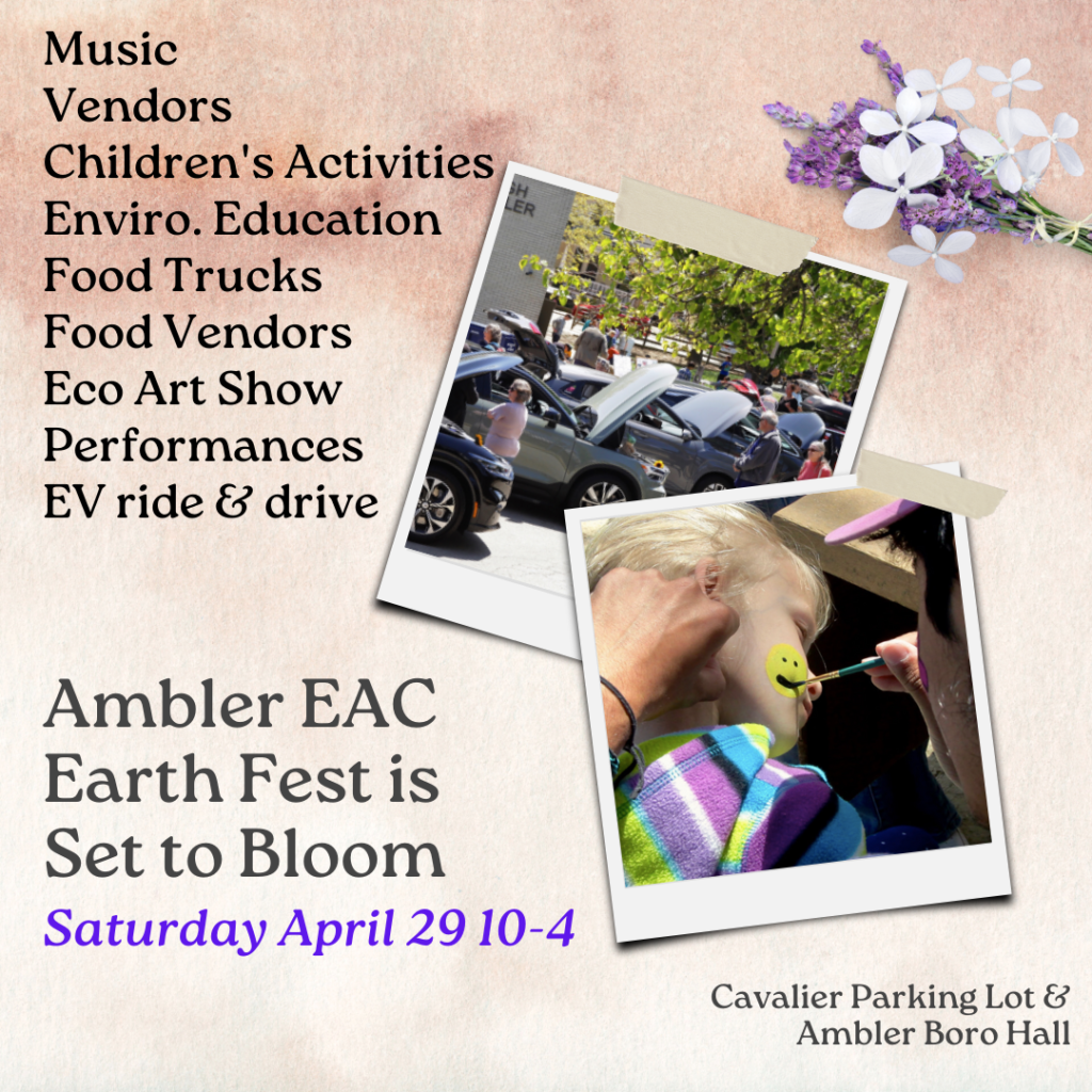 Celebrate Earth Fest with your friends, neighbors, families at the Ambler Environmental Advisory Council (EAC) Earth Fest on Saturday, April 29, 2023 from 10 a.m. to 4 p.m.! This year, our family-friendly Earth Fest is all being held outdoors and it is bigger than ever, with food trucks, shopping, live music, children’s activities, educational opportunities, giveaways, electric vehicle car show, an eco-art show and more.