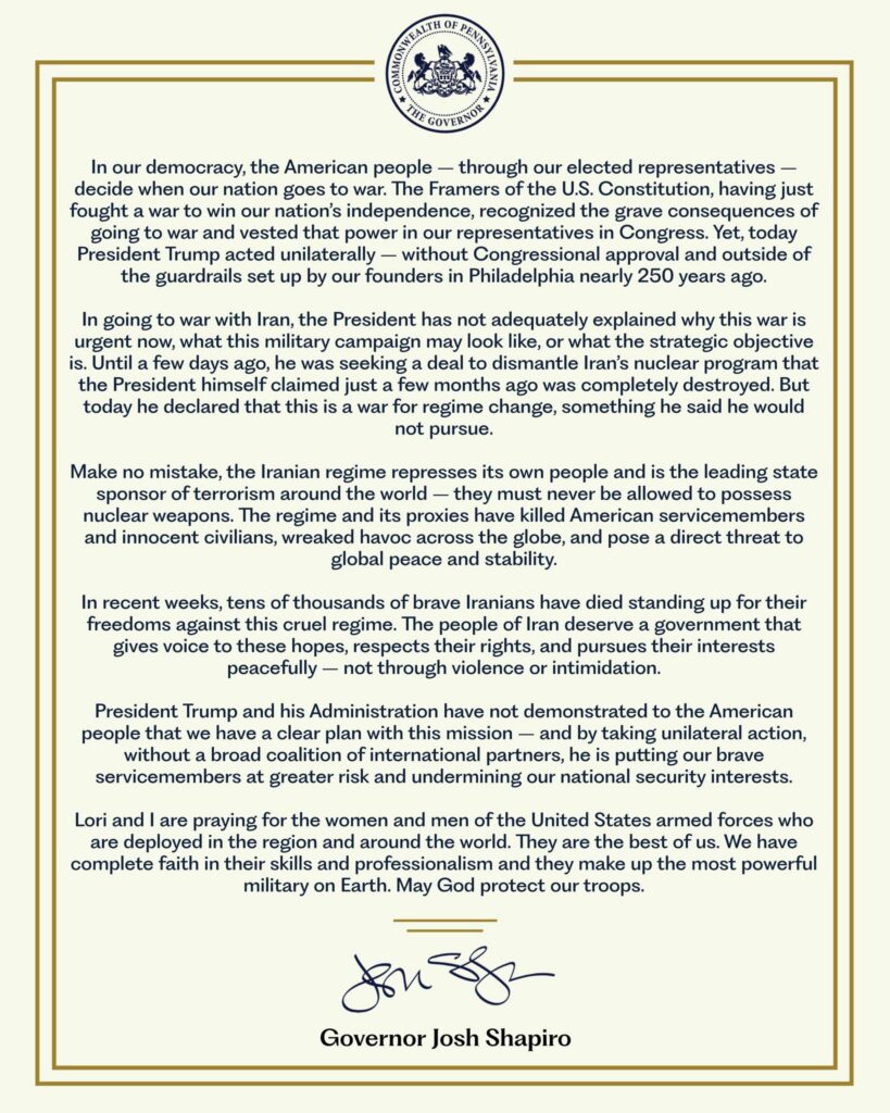 “Today President Trump acted unilaterally — without Congressional approval and outside of the guardrails set up by our founders in Philadelphia nearly 250 years ago,” Shapiro said in the statement. “In going to war with Iran, the President has not adequately explained why this war is urgent now, what this military campaign may look like, or what the strategic objective is.”