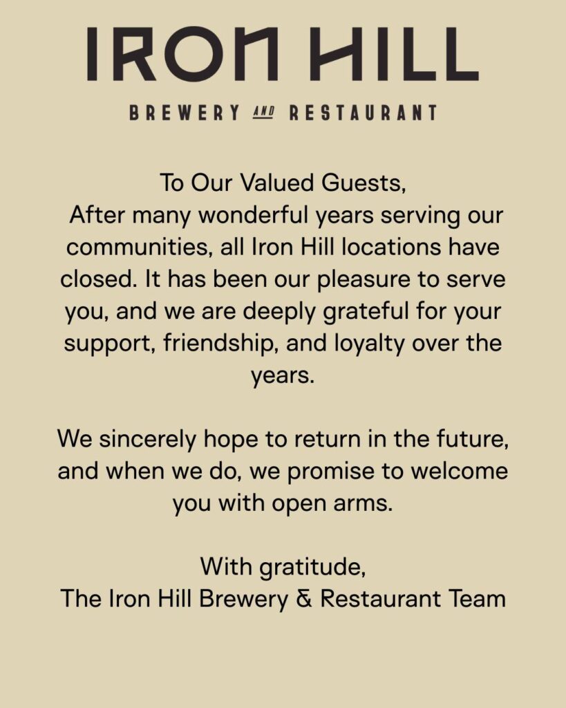 Iron Hill Brewery & Restaurant, a craft brewery and scratch restaurant chain, has announced the immediate closure of their 16 remaining locations, including the restaurant at 1460 Bethlehem Pike in North Wales.