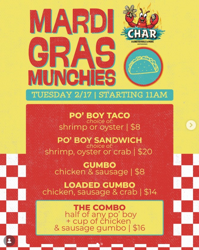 Enjoy a taste of Mardi Gras on Tuesday, February 17th at Char inside Ridge Hall in Ambler. On the menu will Mardi Gras munchies such as a Po’ Boy Taco, Po’ Boy Sandwich, Gumbo, and even a loaded Gumbo. Char will be open at 11:00 a.m.