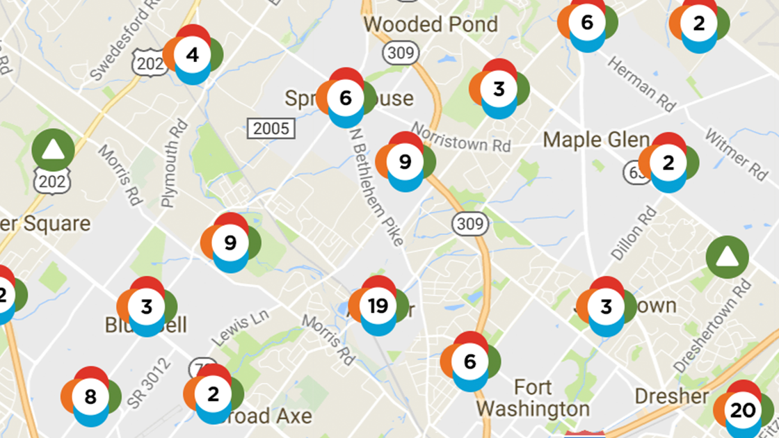 Yesterday morning there were 605 accounts without power in Ambler Borough, and last night the outage map showed 782 accounts without power. This morning the map shows 618 accounts without power.
